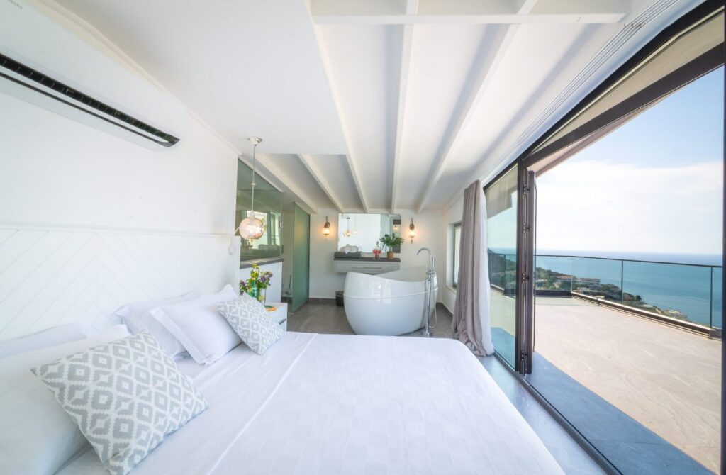 A further flight of stairs takes you to the roof terrace suite complete with luxury ensuite bathroom, and a free standing bathtub with uninterrupted sea views. There is a a large roof top terrace with comfy seating.