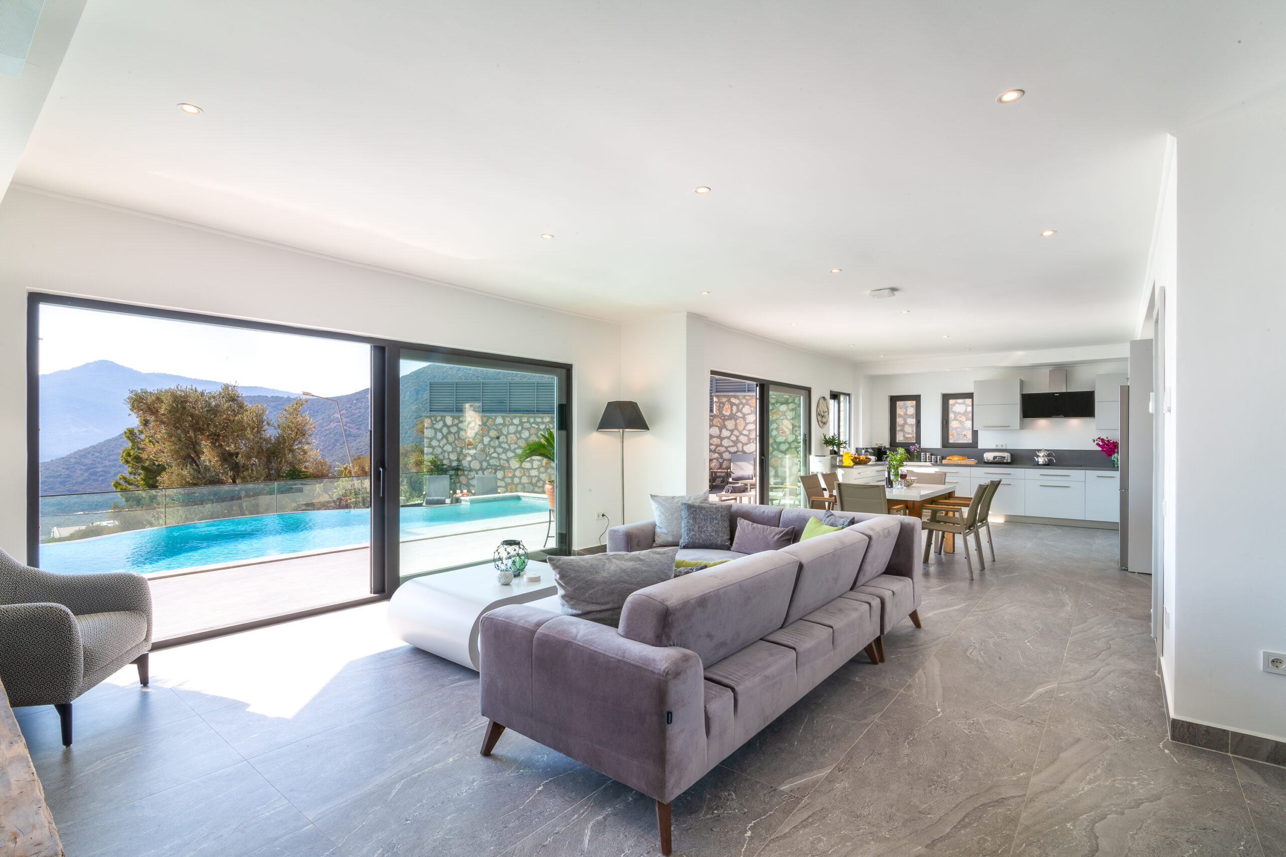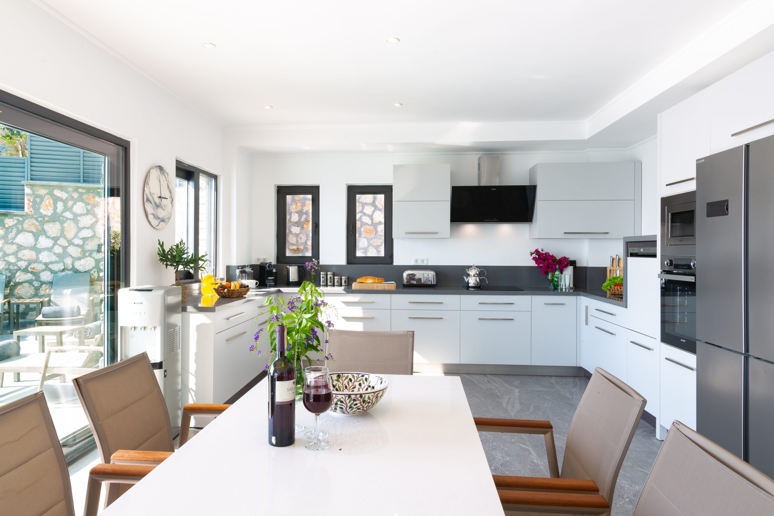 Enter the villa itself and the large, airy, open plan living, and fully equipped kitchen looks out over the pool and pool terrace to the gorgeous sea view beyond.